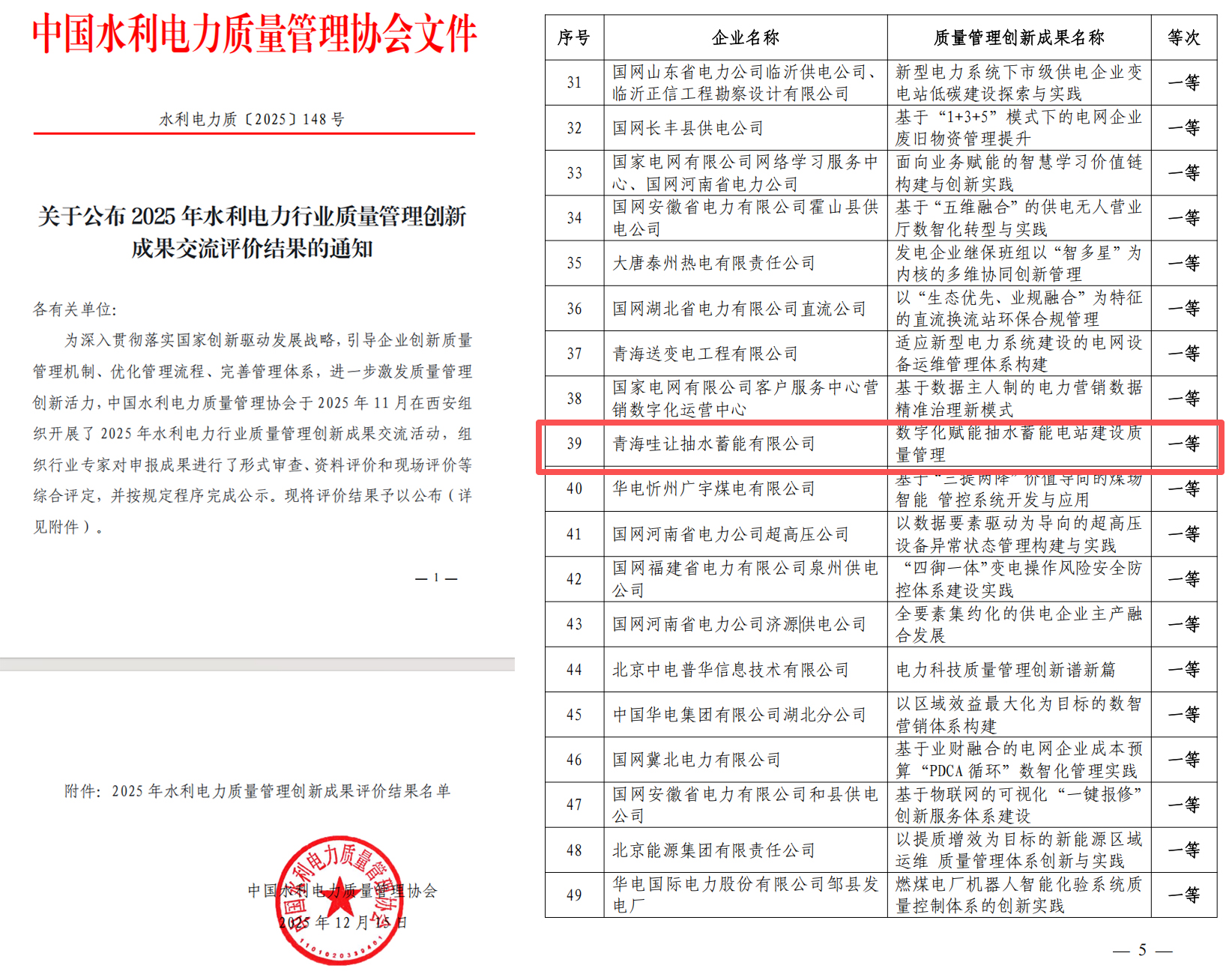 数智赋能,质量创新 ----哇让数字化平台荣获中国水利电力质量协会质量创新管理成果一等评价